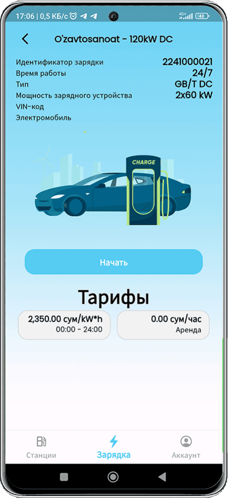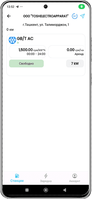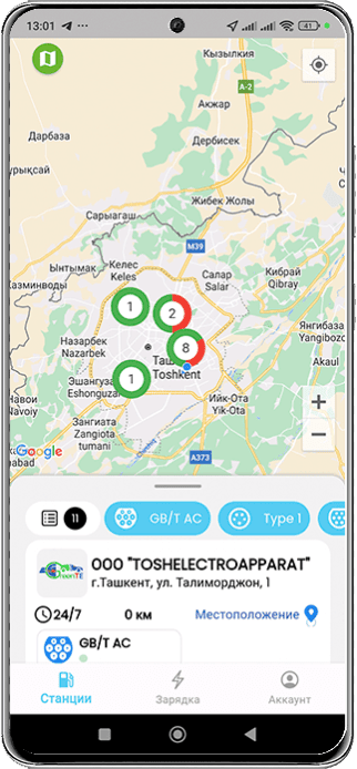 Мобильное приложение GreenTE предназначено для управления зарядными станциями и контролем процесса зарядки. Интерфейс приложения позволяет получать информацию о состоянии зарядных станций и устройств, бронировать место зарядки. В приложение встроена система биллинга для оплаты — каждый пользователь производит оплату за процесс зарядки через индивидуальный счёт в приложении, который можно своевременно пополнять с помощью интегрированной в приложение платёжной системы CLICK. На данный момент разрабатываются методы оплаты, добавлением международных банковских карт. С помощью приложения пользователи могут легко получать уведомления о процессе заряда, статусе зарядных станций, а также получать информацию о доступных тарифах и услугах. Мобильное приложение Green TE — это удобный и эффективный инструмент для взаимодействия с зарядными станциями и повышения эффективности использования энергии.
